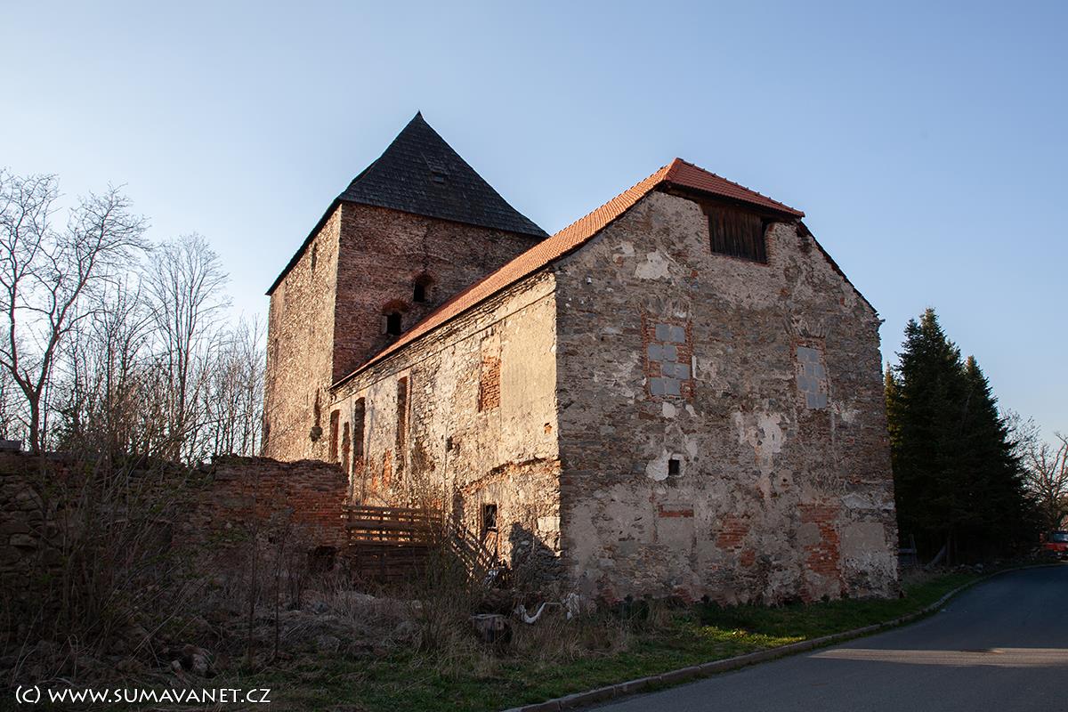 Mohutná věž čachrovské tvrze je dodnes dominantou obce, nicméně je obklopena velkým množstvím vzrostlých stromů, které ji zastiňují.