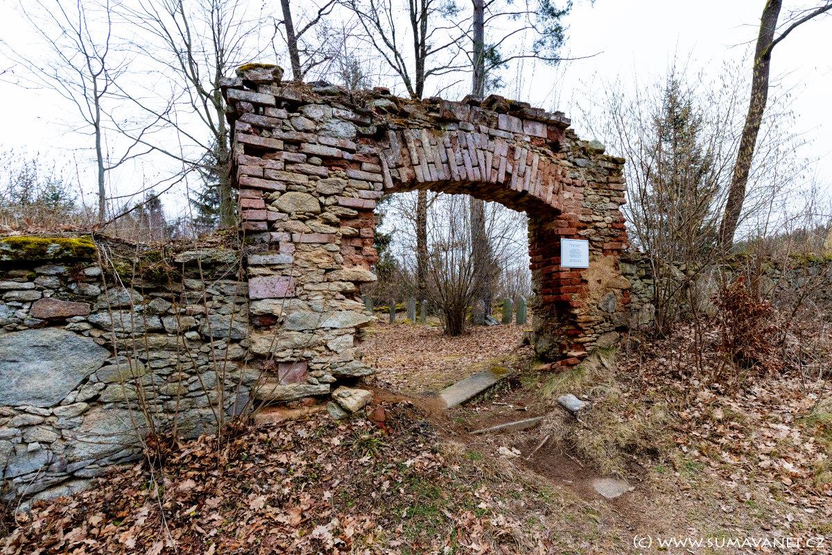 V podélné straně souběžné s lesní cestou ve střední ose zděná vstupní brána převyšující ohrazení.